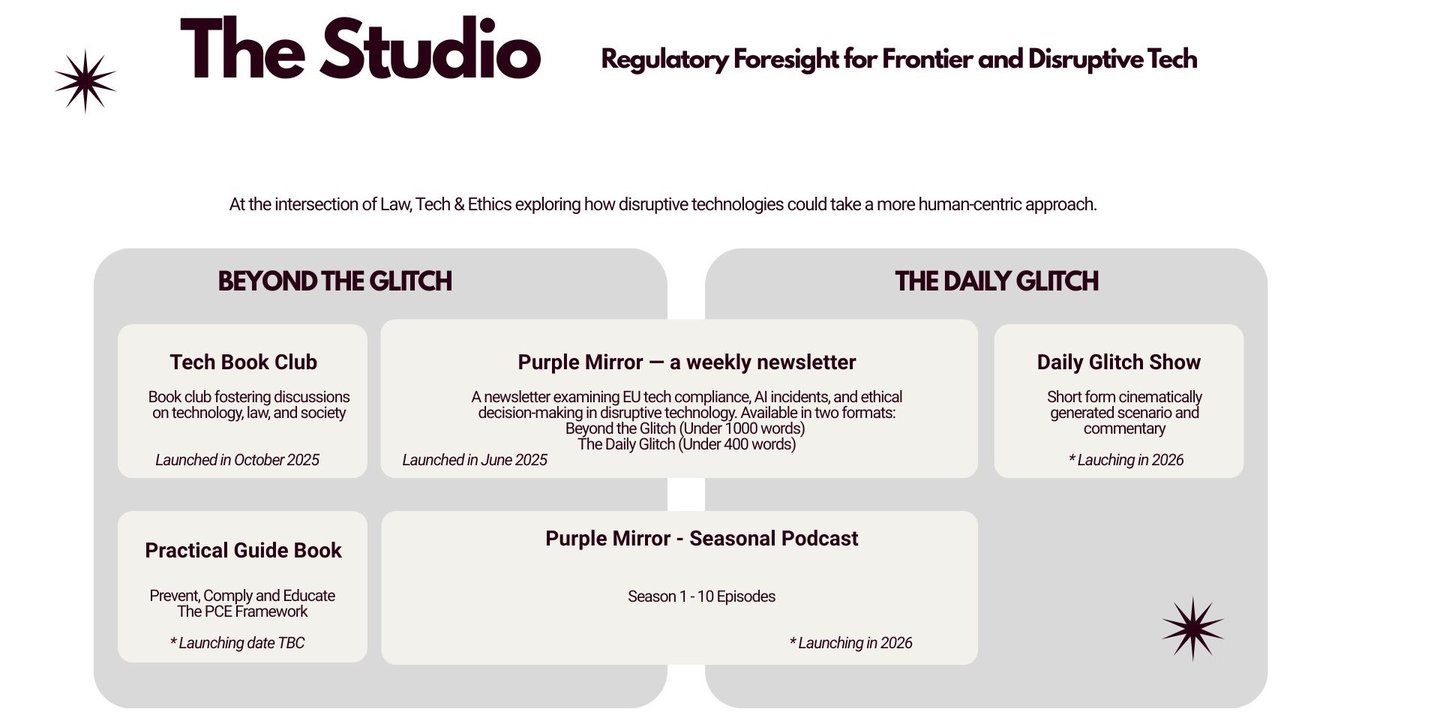 In Purple Mirror, we explore those questions through a Compliance, Ethical, and Regulatory lens and examine how those disruptive and frontier technologies shape society and individual rights. Our guiding framework, Prevent, Comply, Educate (PCE), provides a practical path toward responsible and human-centric innovation.